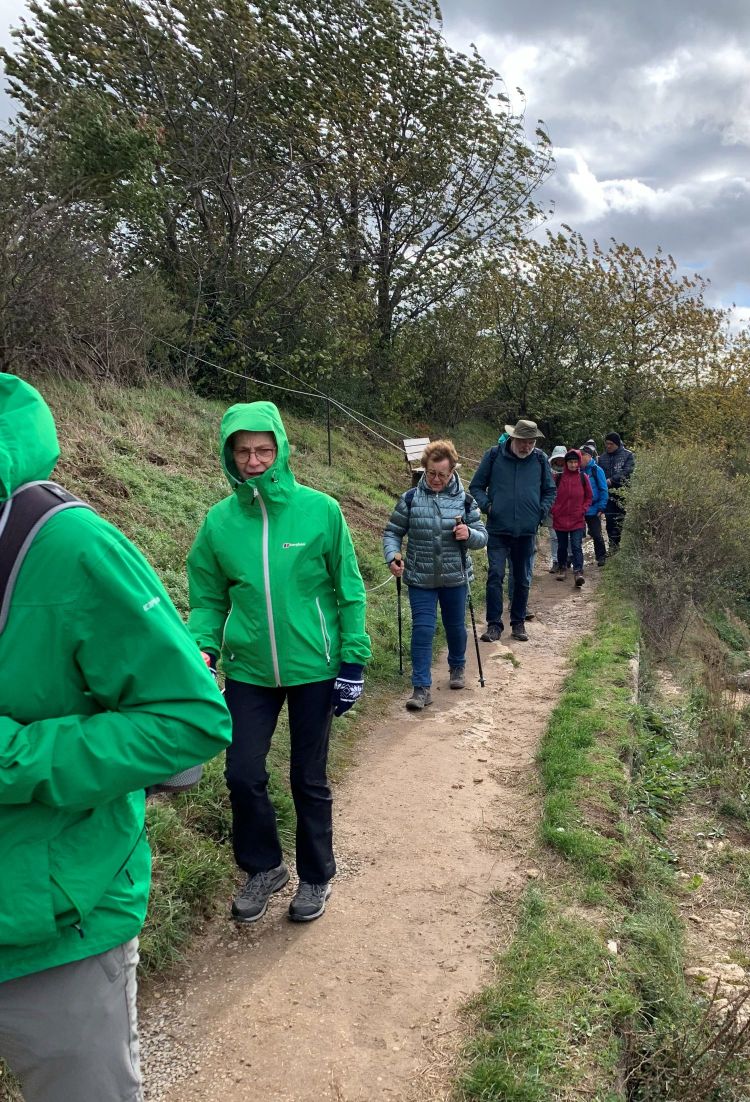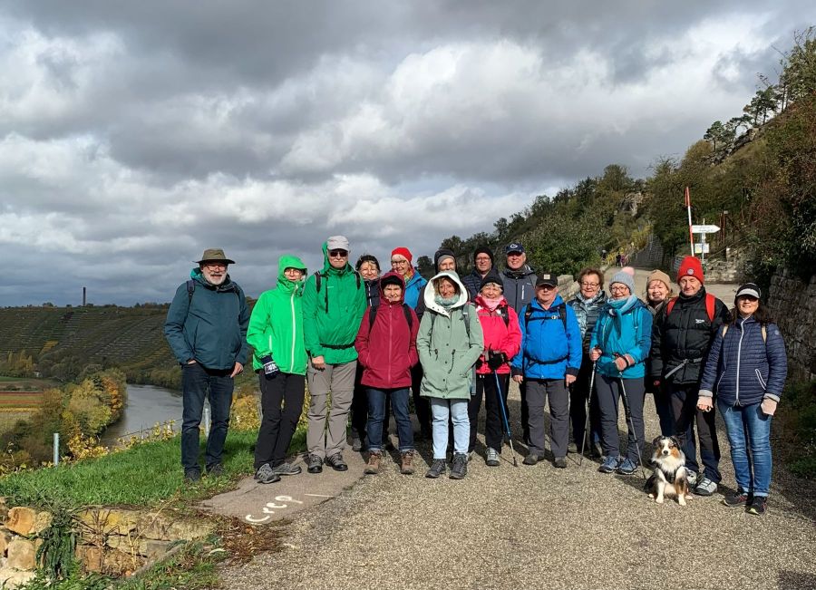 Trotz wenig einladender Wetterprognosen trafen sich am Sonntag, den 26. Oktober 2025, 18 wanderfreudige Naturbegeisterte zur gemeinsamen Tour rund um Hessigheim. In Fahrgemeinschaften ging es zum Ausgangspunkt – und gleich zu Beginn wartete ein steiler Anstieg, der uns ordentlich ins Schwitzen brachte.