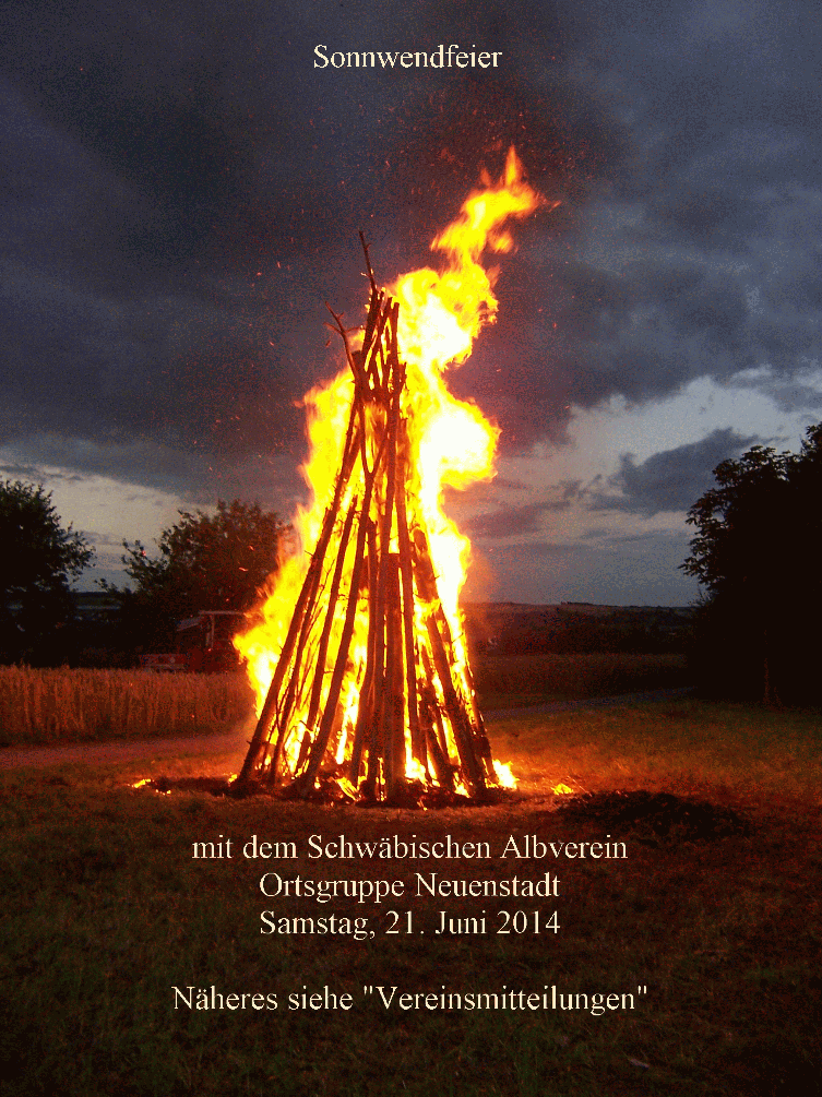 Am 21. Juni 2014 ab 19 Uhr findet unsere schon zur Tradition gewordene Sonnwendfeier am Wasserhäusle in Neuenstadt statt.